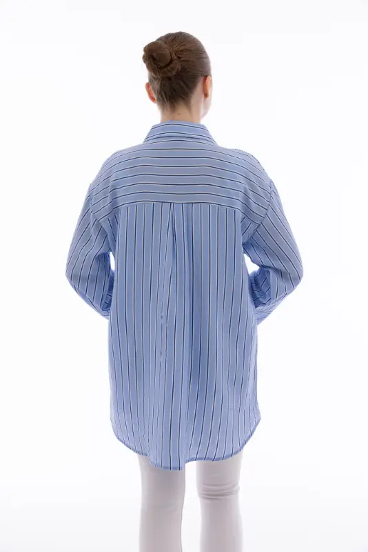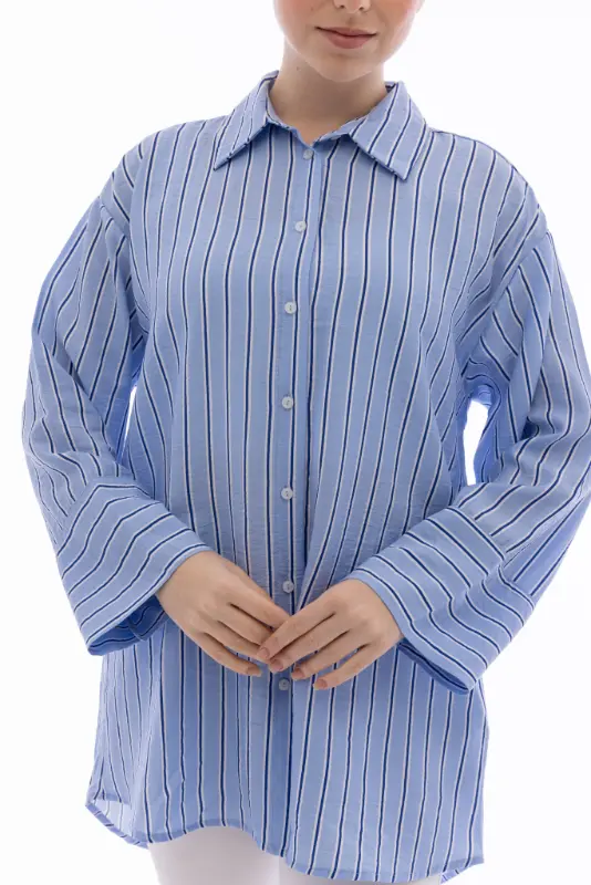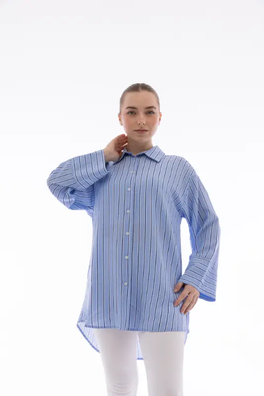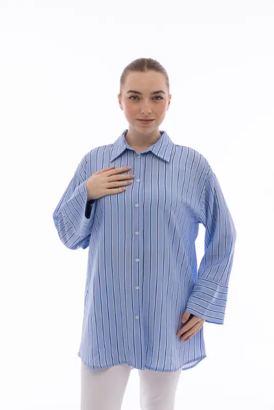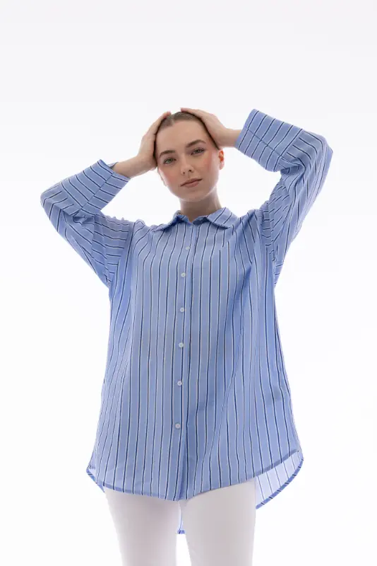 Rahatlığı ve şıklığı bir araya getiren Kadın İpliği Boyalı Oversize Bulut Mavi Çizgili Gömlek, modern kesimi ve zarif çizgili deseniyle stilinize sofistike bir hava katıyor. Hafif ve nefes alabilen kumaşı sayesinde gün boyu konfor sağlarken, oversize kalıbı ile rahat ve salaş bir duruş sunar.