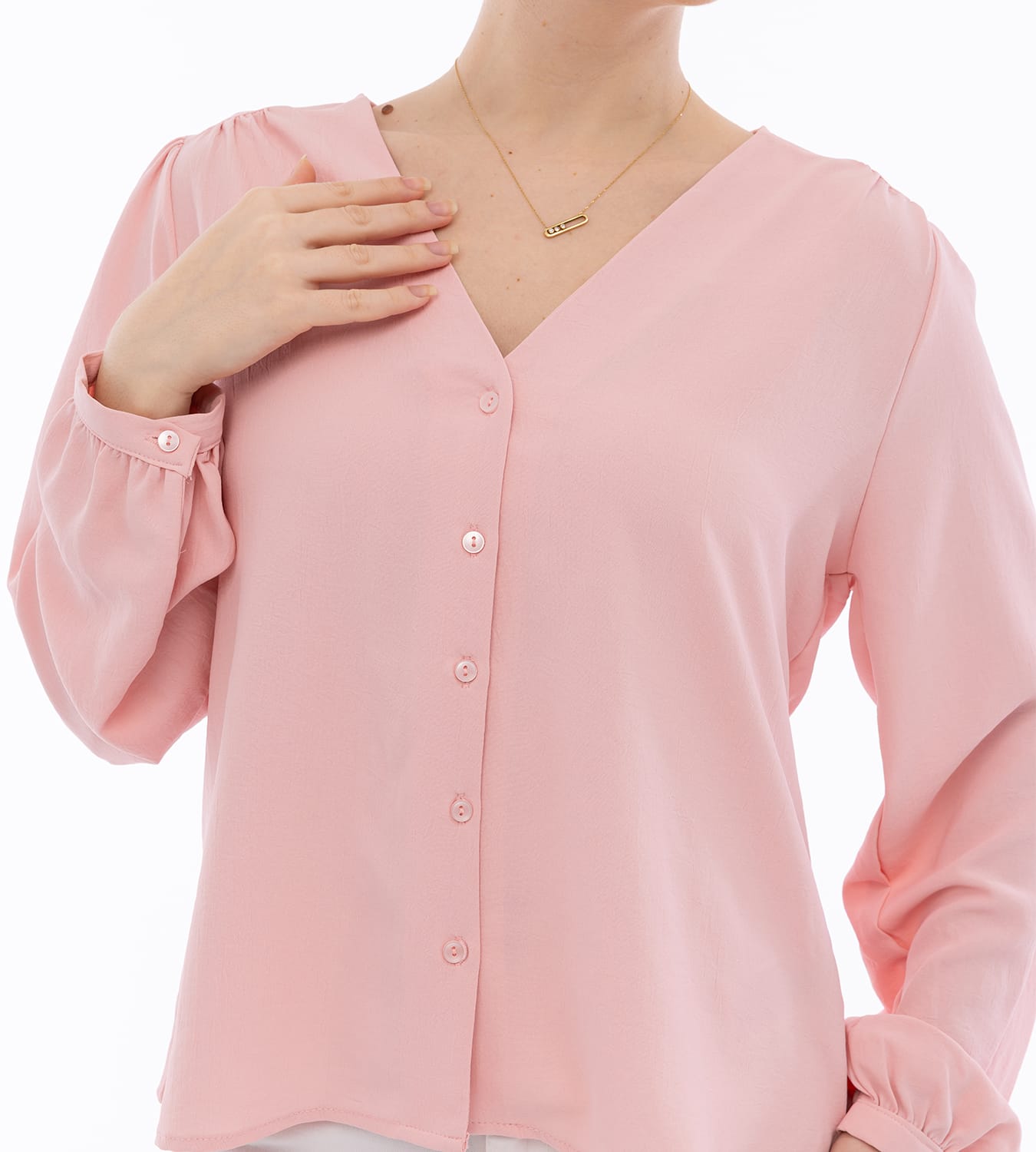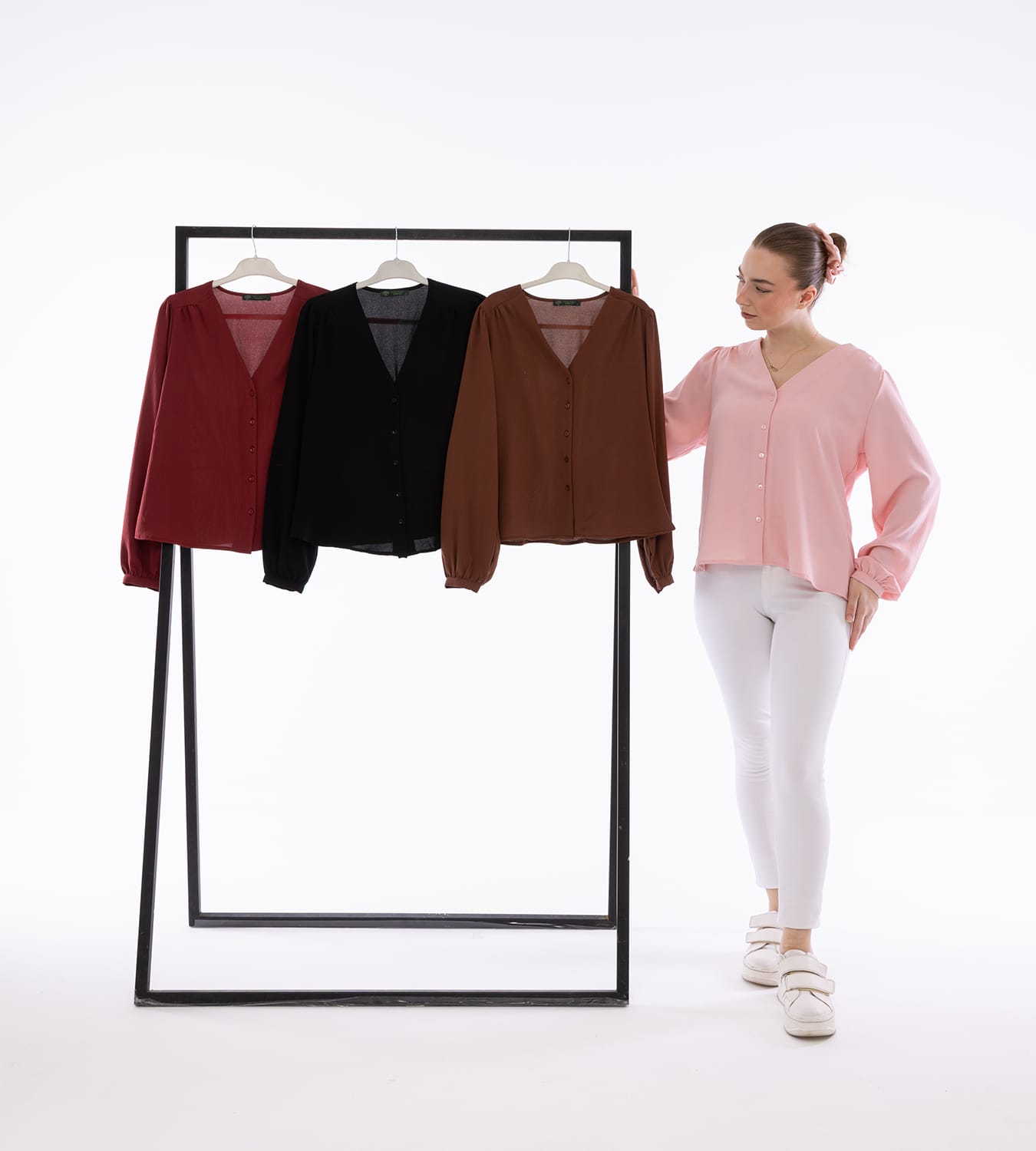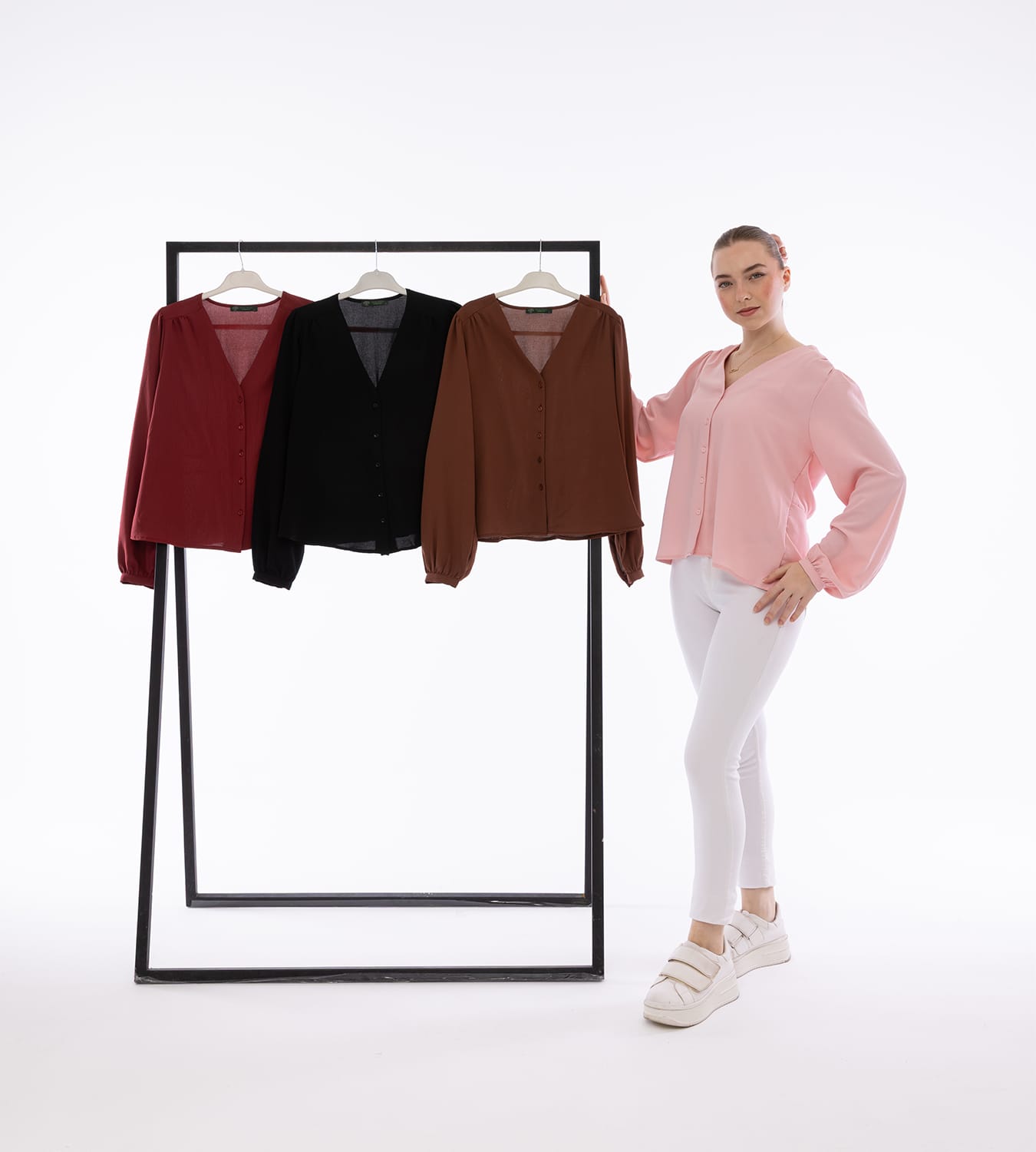 Şıklık ve konforu bir araya getiren bu viskon bluz, hafif ve nefes alabilen kumaşıyla gün boyu rahatlık sunar. V yaka ve büzgü detaylarıyla zarif bir görünüm kazandıran model, hem günlük kullanıma hem de özel davetlere uygundur. 36-46 beden aralığında mevcuttur. Şimdi sipariş verin!